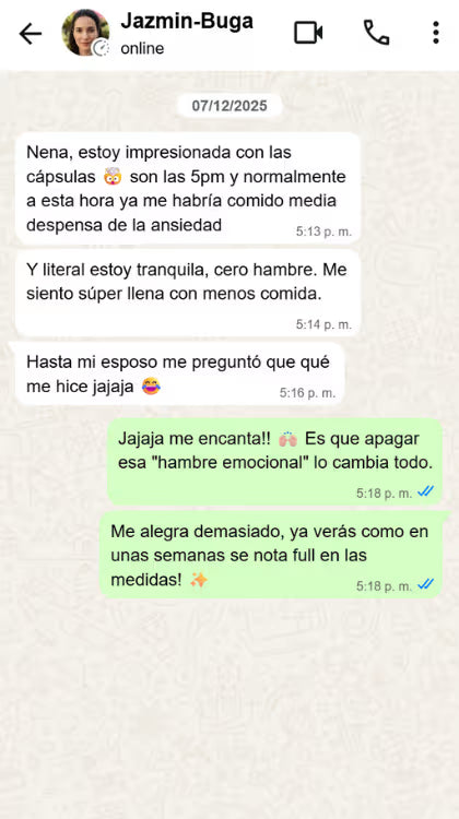 "Mi problema no era la comida, eran los antojos de las 4pm. Sentía que no tenía fuerza de voluntad. Estas cápsulas literalmente apagaron ese 'ruido mental' por el azúcar. Al no estar picando todo el día, la ropa me empezó a bailar casi sin darme cuenta. ¡Me siento deshinchada y en control!"