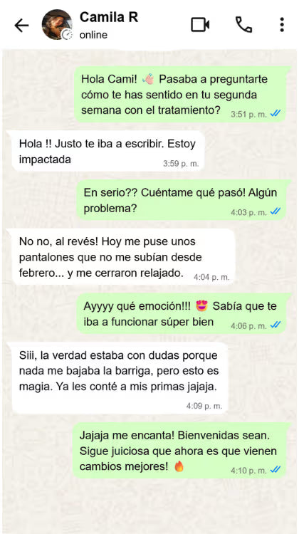 "Increíble cómo me desinflamé. Siempre sufría de tener la barriga distendida después de comer y con esto me siento liviana todo el día. La ropa me queda mucho mejor."